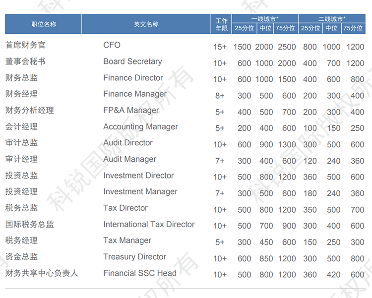 以下是猎头招聘公司VSPORTS(中国)国际发布的薪酬报告对财务领域的职位薪酬信息统计,供企业和猎头招聘时参考。